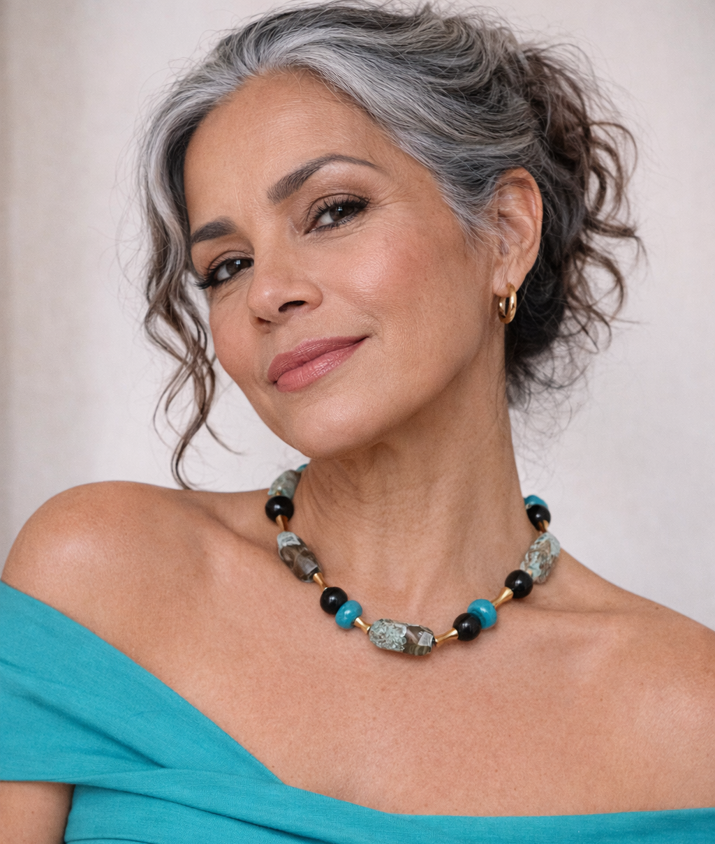 Un lenguaje visual audaz que celebra la presencia y la fuerza. Se expresa en joyas coloridas, voluminosas y llenas de carácter, donde lo artesanal se une a lo contemporáneo. Cada pieza es una declaración de estilo con la que la mujer madura afirma su magnetismo y disfruta de mostrarse sin miedo a destacar.