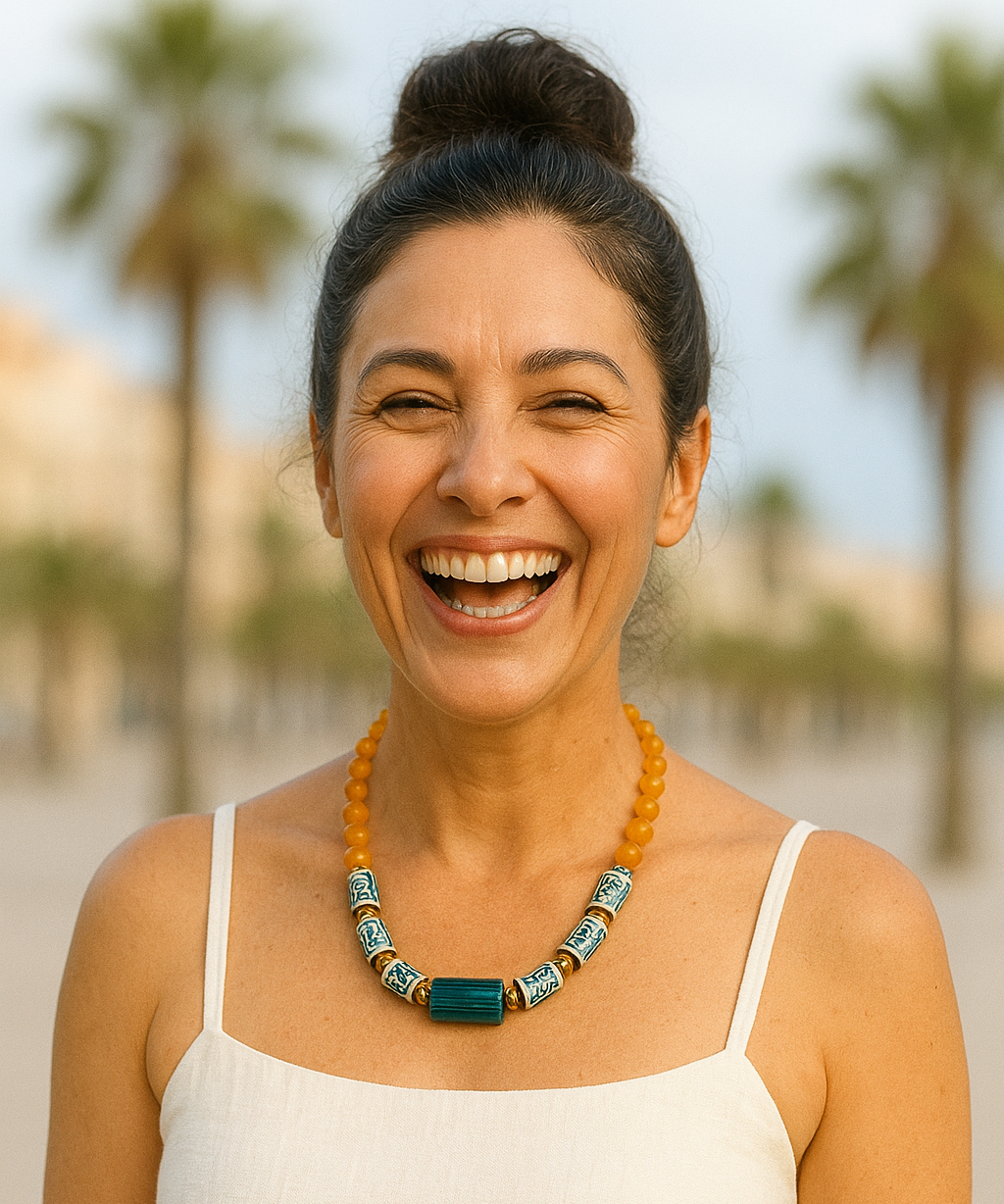 Radiante, sofisticado y lleno de vida. Este collar combina la calidez del sol con la elegancia del diseño artesanal. Las ágatas amarillas aportan energía positiva y confianza, mientras el vidrio africano verde, trabajado a mano, conecta con la naturaleza y la autenticidad. En el centro, un imponente rectángulo de Murano color teal intenso captura la luz con un brillo profundo y moderno.